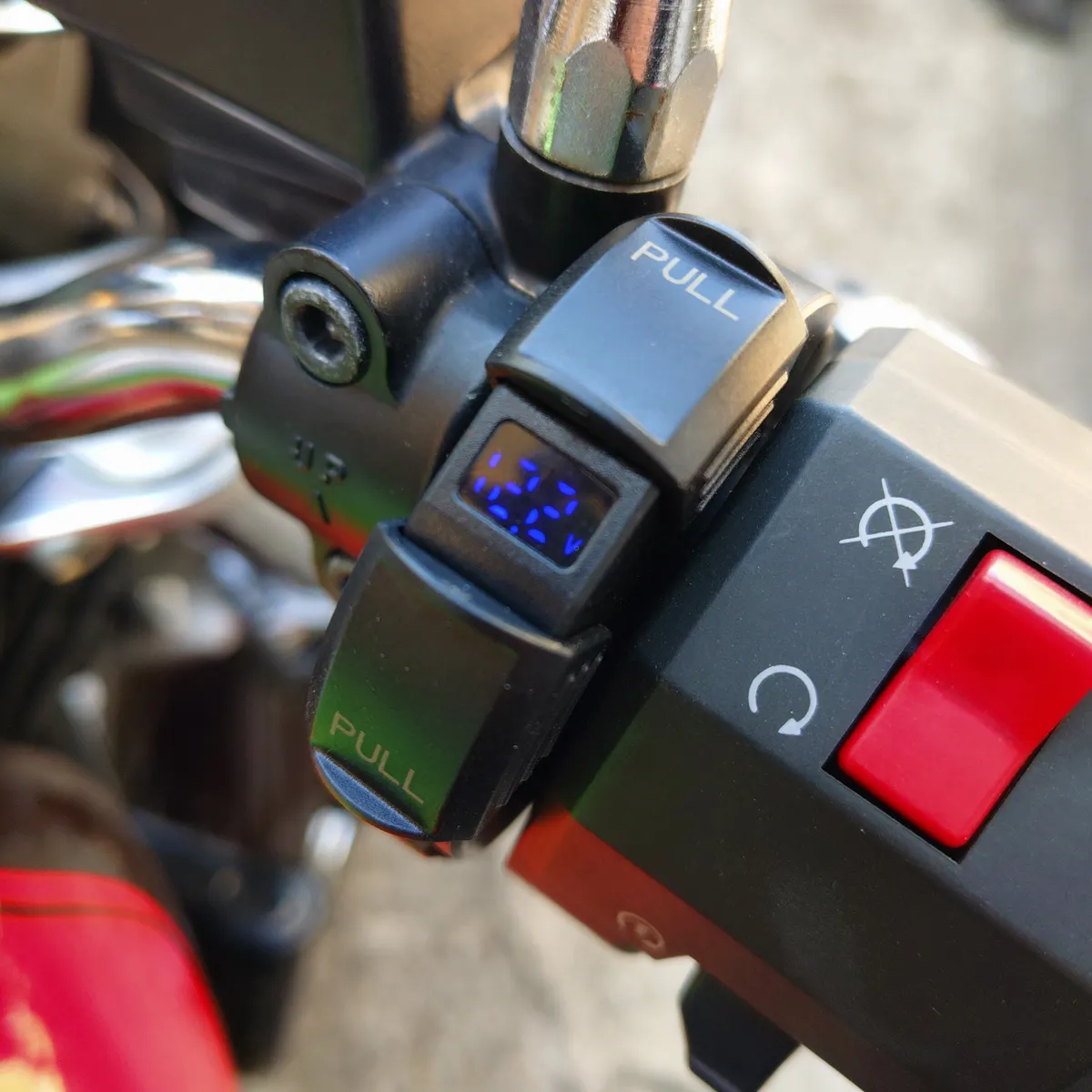 デイトナのじゃなくてスミマセン。スロットル横に今までもカエディアの2個口USBコネクター付けてましたが、電圧計も搭載されたモノが発売されたので買い替えました。