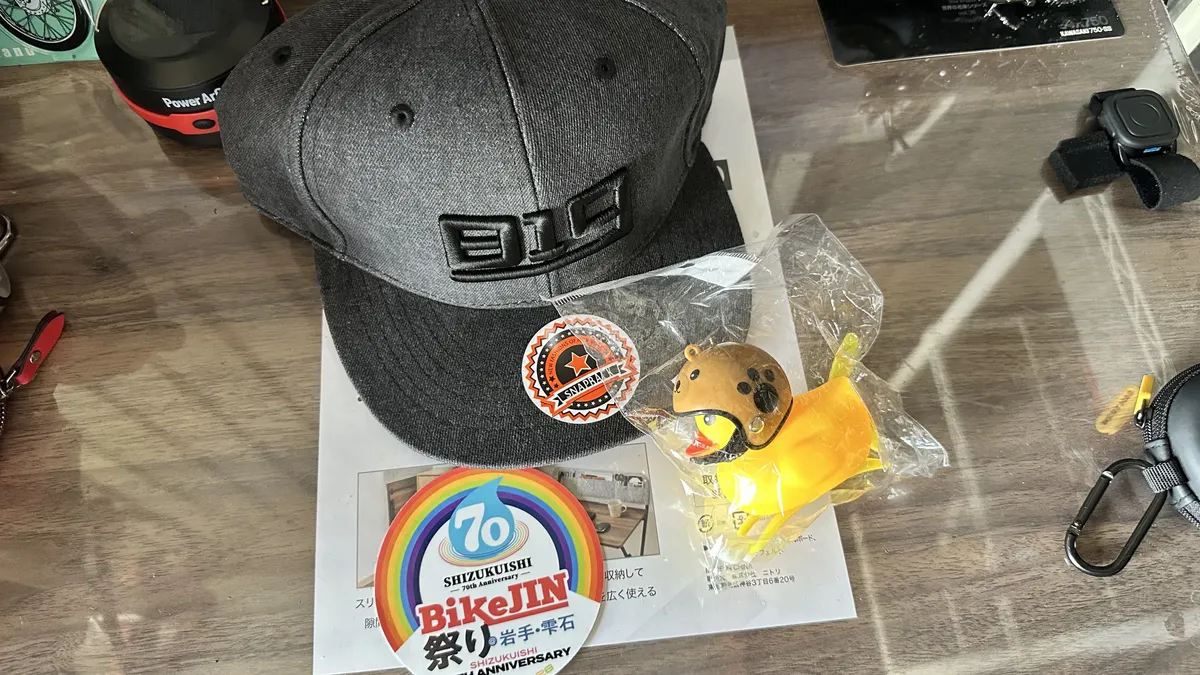 来場記念のステッカーとお土産に買ったBikeJINキャップとアヒル将軍