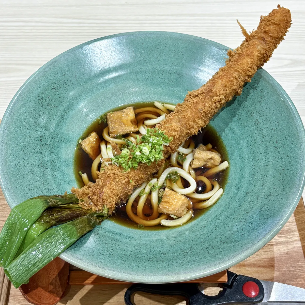 このままかぶりつきは無理なので付属のハサミでカットして食べていきます、やや辛口のうどん汁に甘みのあるネギがよく合っててなかなかいけました😋