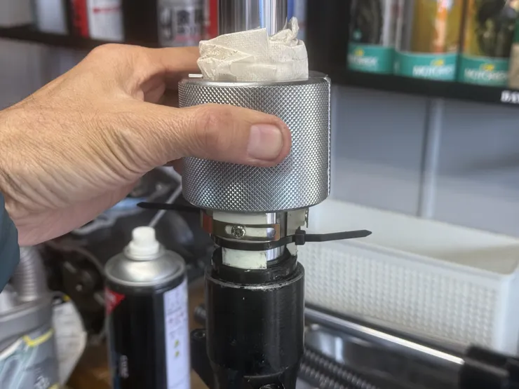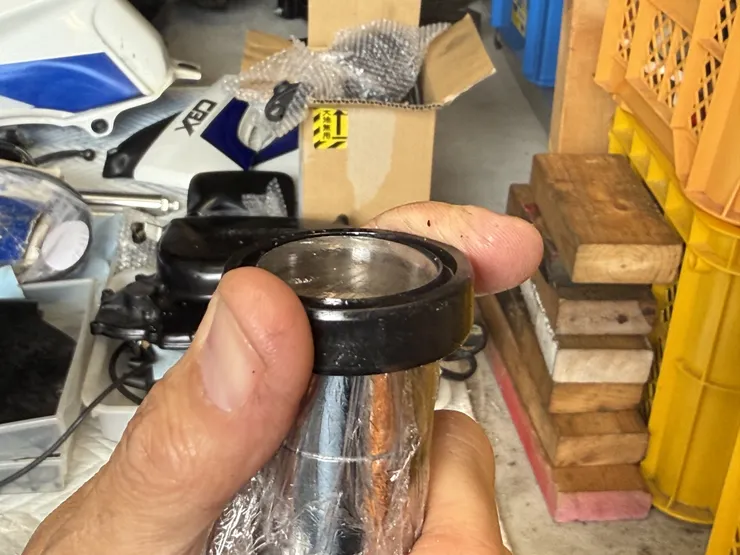 バラしたまま一年近く放置していたCBX250Sのフロントフォークを組み立てました。インナーチューブは点サビが出ていたのですが、40年前の車両なので純正部品は望むべくもなく、東洋硬化さんでハードクロームの再メッキして再生。シール類も色々と流用して何とか賄いました。フォークシールを打ち込むときに巻いている紙は、細いインナーチューブとシールドライバーとの隙間を埋めるスペーサー代わりです。