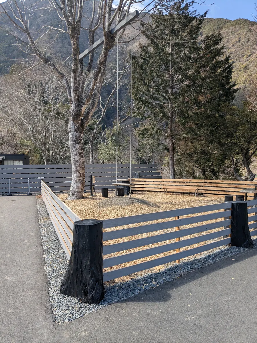 外にはハイジ風ブランコが。ハイジくらい漕げたら林の向こうの川が見えるかも?