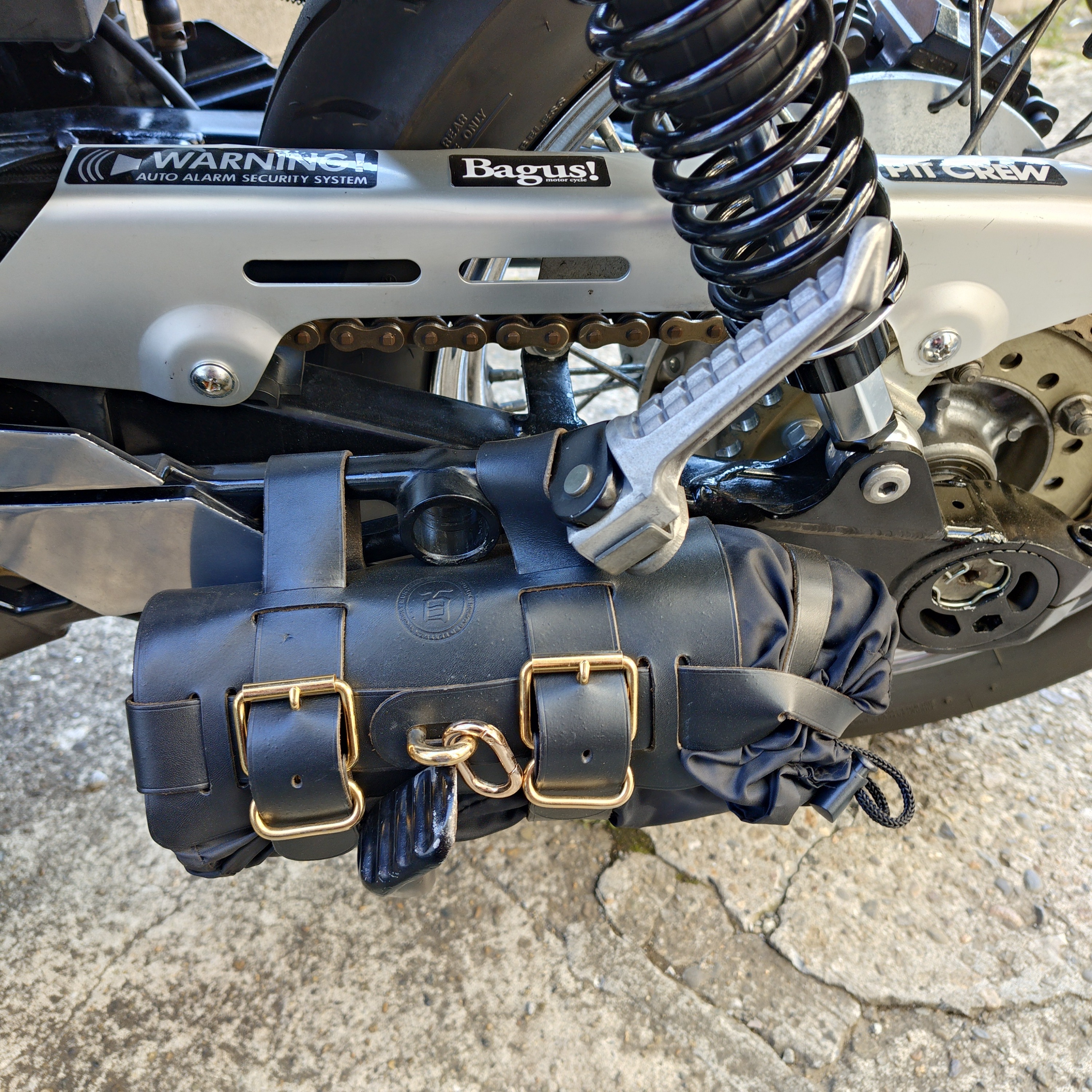 余談ですが、以前乗っていたSPEED400に使っていたガソリンボトルケースをようやくとうちゃん号に取り付けました。先日マフラーを集合管に変えて、左側からサイレンサーがいなくなった所にぴったり収まりました。これでガス欠の心配が減りました。