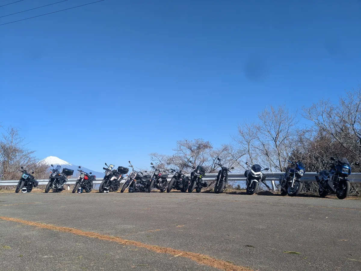 どうにか山頂へ到着。そして皆でなにごともなかったかのようにバイクを並べて撮影。標高700mからの景色は全方向見渡せる素晴らしいものでしたが、正直帰りの心配ばかりしていて楽しむ余裕なし(笑)