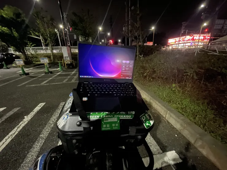 何度もエンジンをかける都合上、住宅街ではしんどいので道の駅まで出掛けてきまして、シートバッグの上にノートPCをドン。