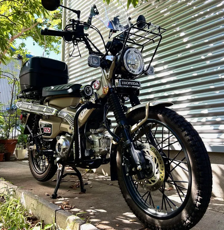 CT110ルックのマフラー。見た目はGOODだけど結構な重低音なので、マフラーのエンドに48Φバッフル(表・裏)→+41Φバッフルの2枚重ね→空いた部分にステンレスたわしを詰める、と毎日少しづつテストしてみる状態。ほんの数dBの違いだけど、かなりジェントルな音になってきたかな。ただステンたわしだと心許ないので、代わりにグラスウールを詰めて完結、としたいところ。