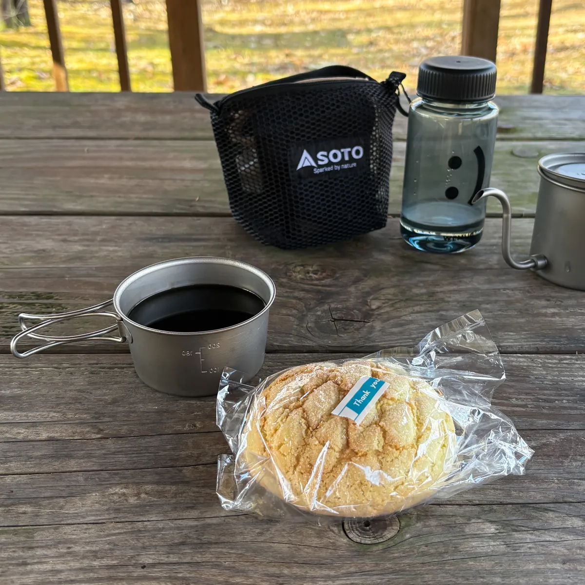 休憩所でコーヒーを淹れてメロンパンでカロリー補給、のんびりしてる間にバイク5台くらいとジムニー2台が通り過ぎて行きました、なかなか盛況(笑)