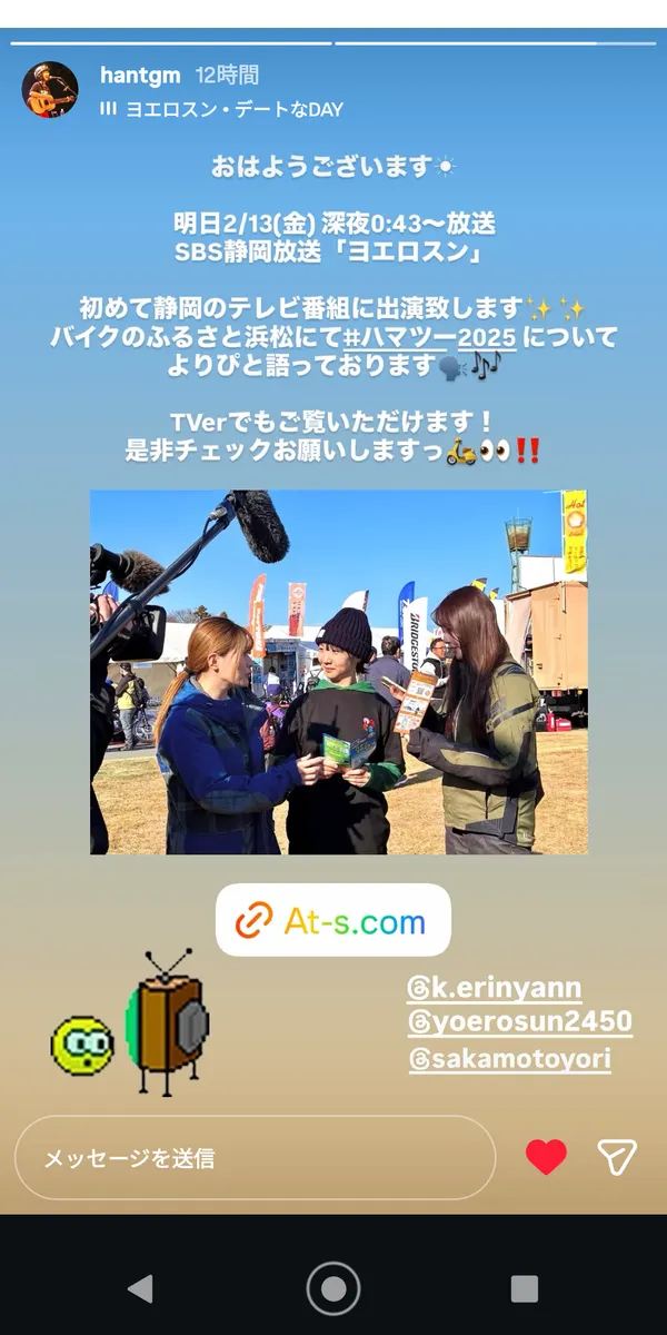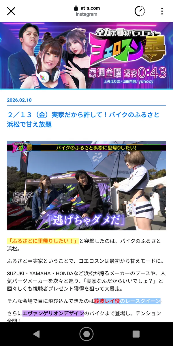 トップ > いろんなイベント > 静岡のテレビにDAYTONAさんが かみ~ゆ 2026/02/12 21:27 静岡のテレビにDAYTONAさんが 静岡のローカルTV「ヨエロスン」にDAYTONAさんが登場❗ 昨年12月に開催された バイクのふるさと浜松2025で収録されたものです。 えりにゃんとモンディさんに商品説明してるとこですかね✨ 明日(13日)、夜中0時43分 静岡SBSで放映されます。 この放送には、浜名湖朝活カフェにも参加していた、歌うバイク女子花野ちゃんとよりぴさんもインタビュー受けてます。 静岡以外の人は翌日12時からTVerで放映しますので是非見て、DAYTONAさんにコメント送りましょう。 バイクのふるさと浜松 花野 よりぴ えりにゃん いいね 共有する 共有する X facebook リンクをコピー コメントする 1 件の返信 (新着順) ミュートしたユーザーの投稿です。 投稿を表示 TeamPRIDEONE 2026/02/13 06:22 Tverで見てみます。 いいね 返信する