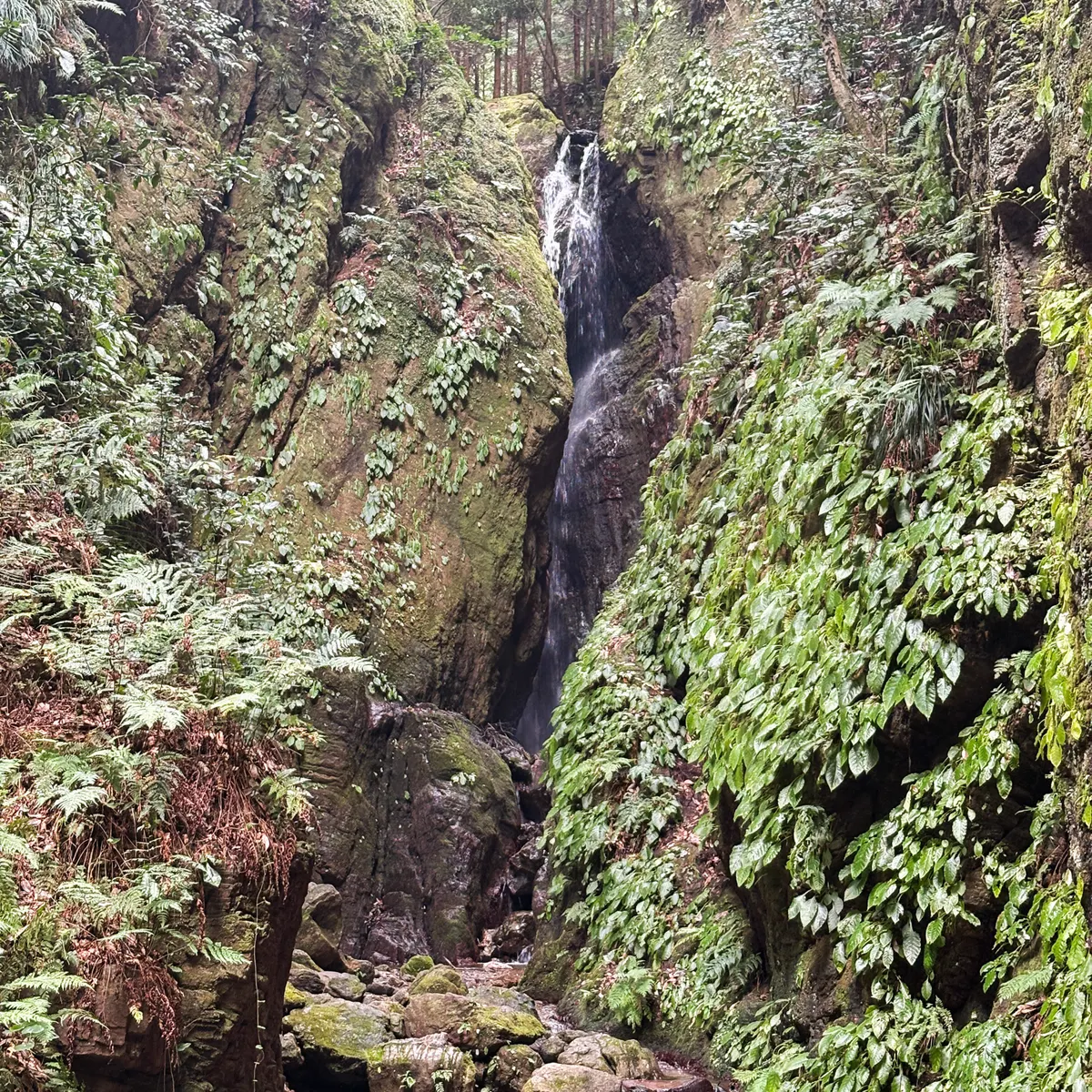 駐車場から10分くらい歩くと一つめの天狗滝にたどり着きます、道からも少し見えますが近くで見るには足場の悪い通路を進む必要があります。