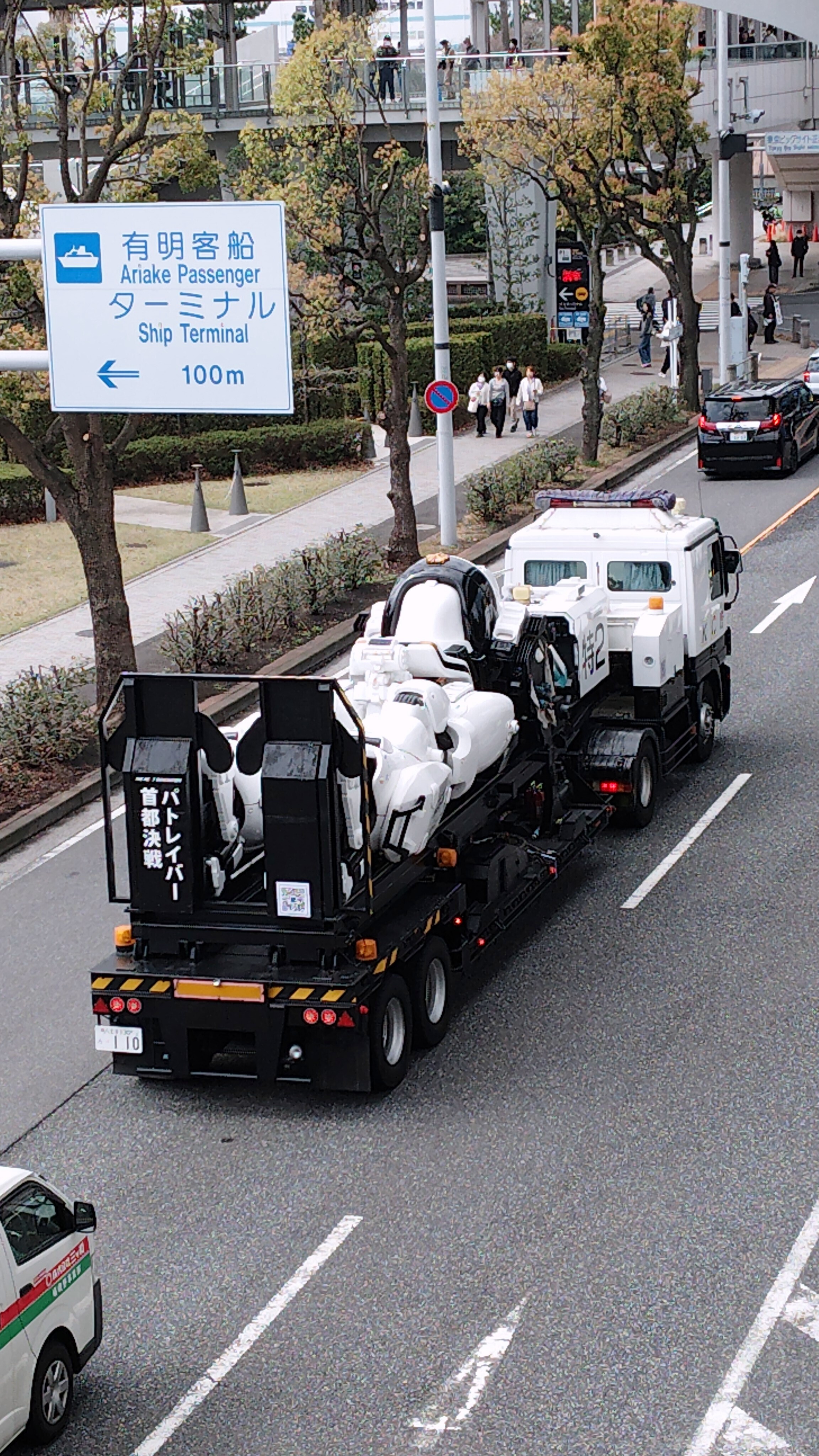 会場に向かってたらパトレイバーが運ばれてました。お勤めご苦労さまです!