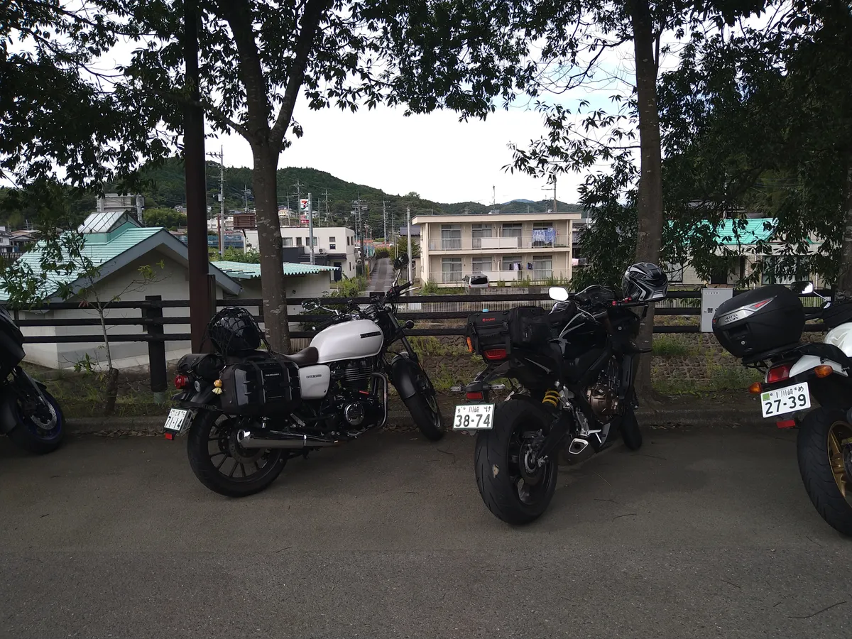 あまり駐車場が広くないので、バイクたちは周りの空スペースへ