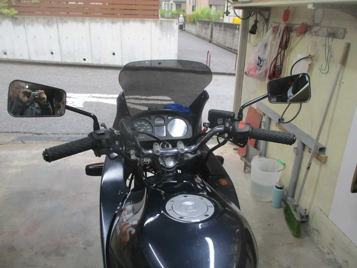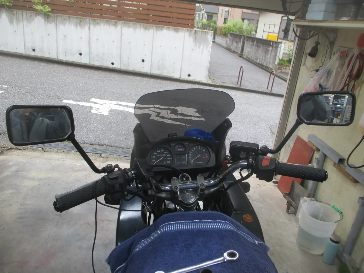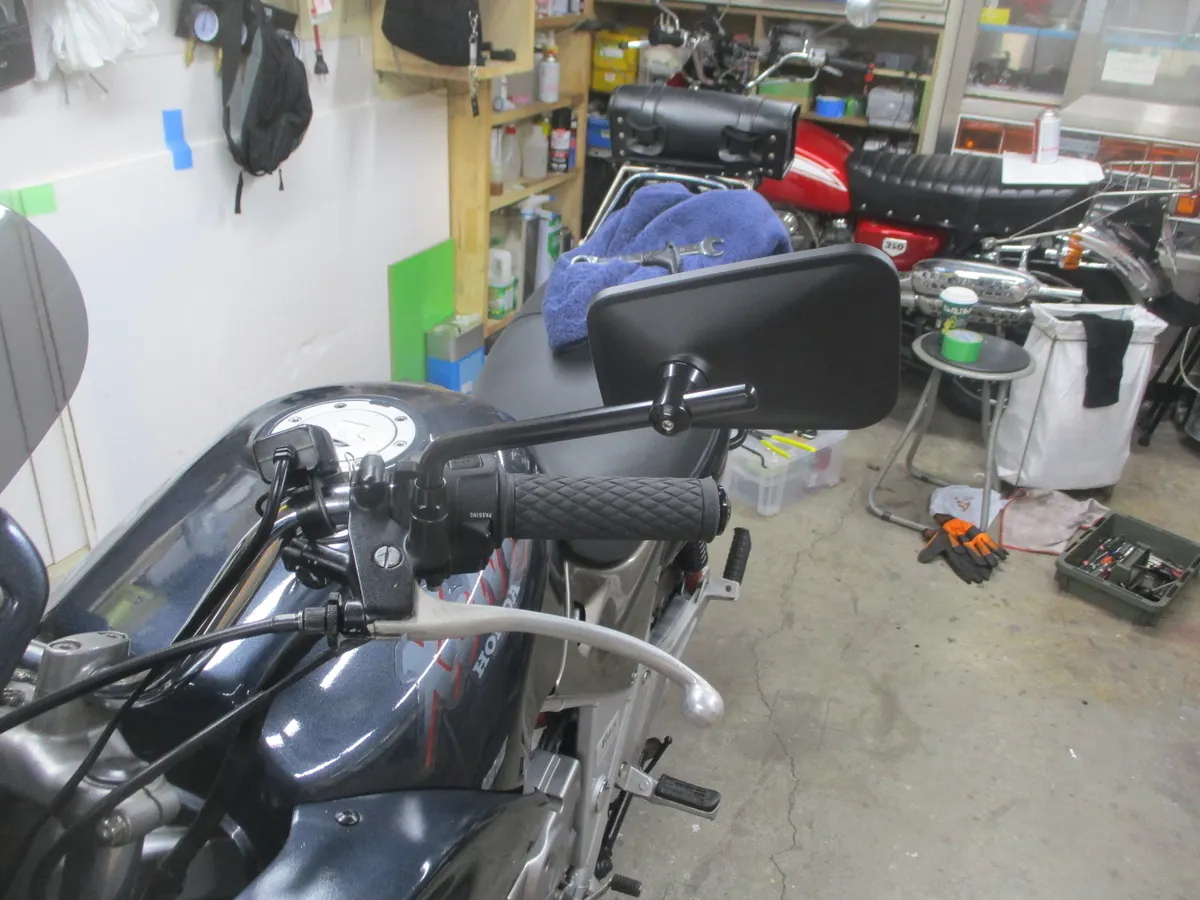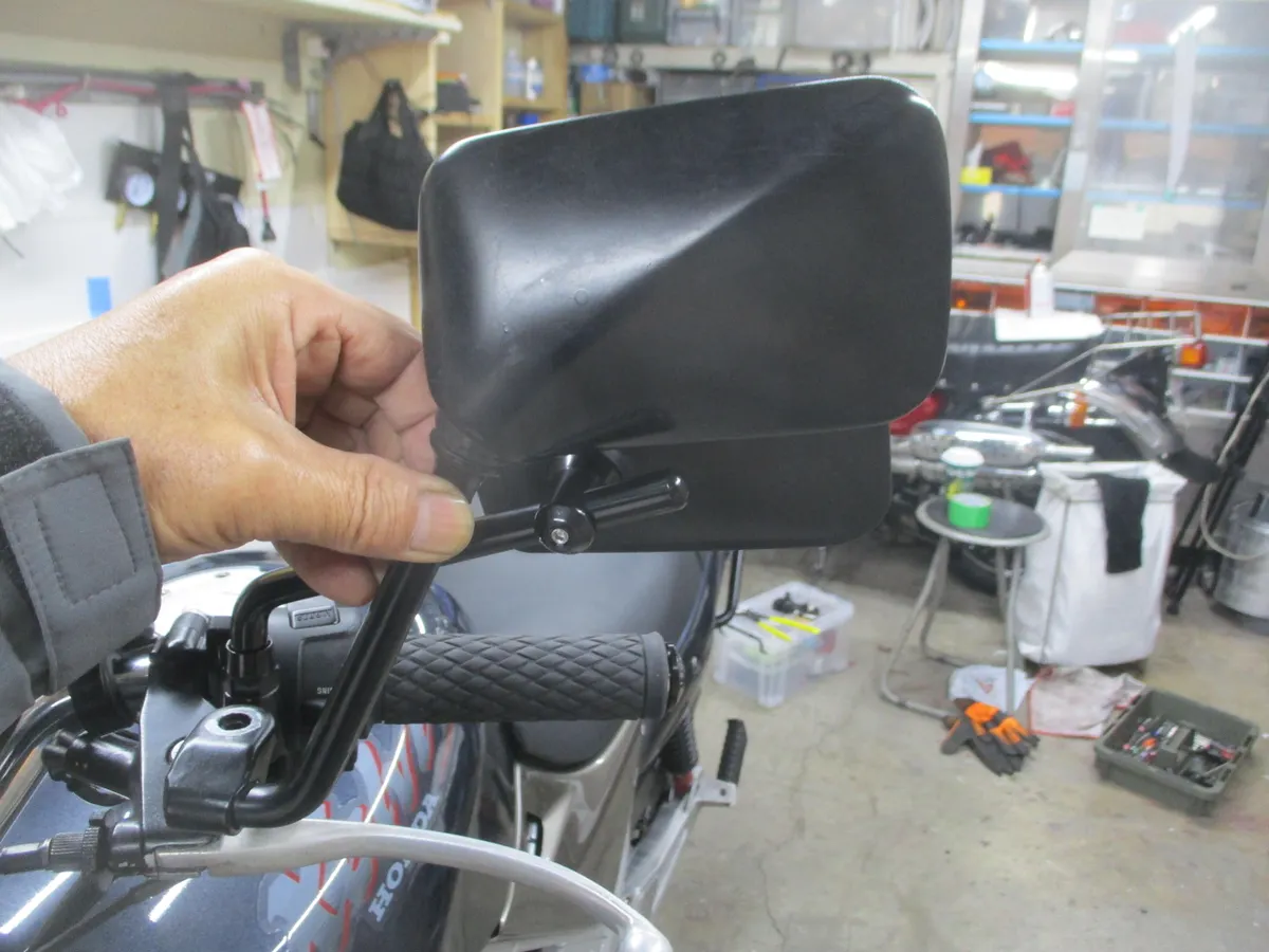 ミラーの位置はオリジナルよりも5センチほど低くなりましたが、ハンドルをアップタイプに交換しているので視線の向きはあまり変わりません。