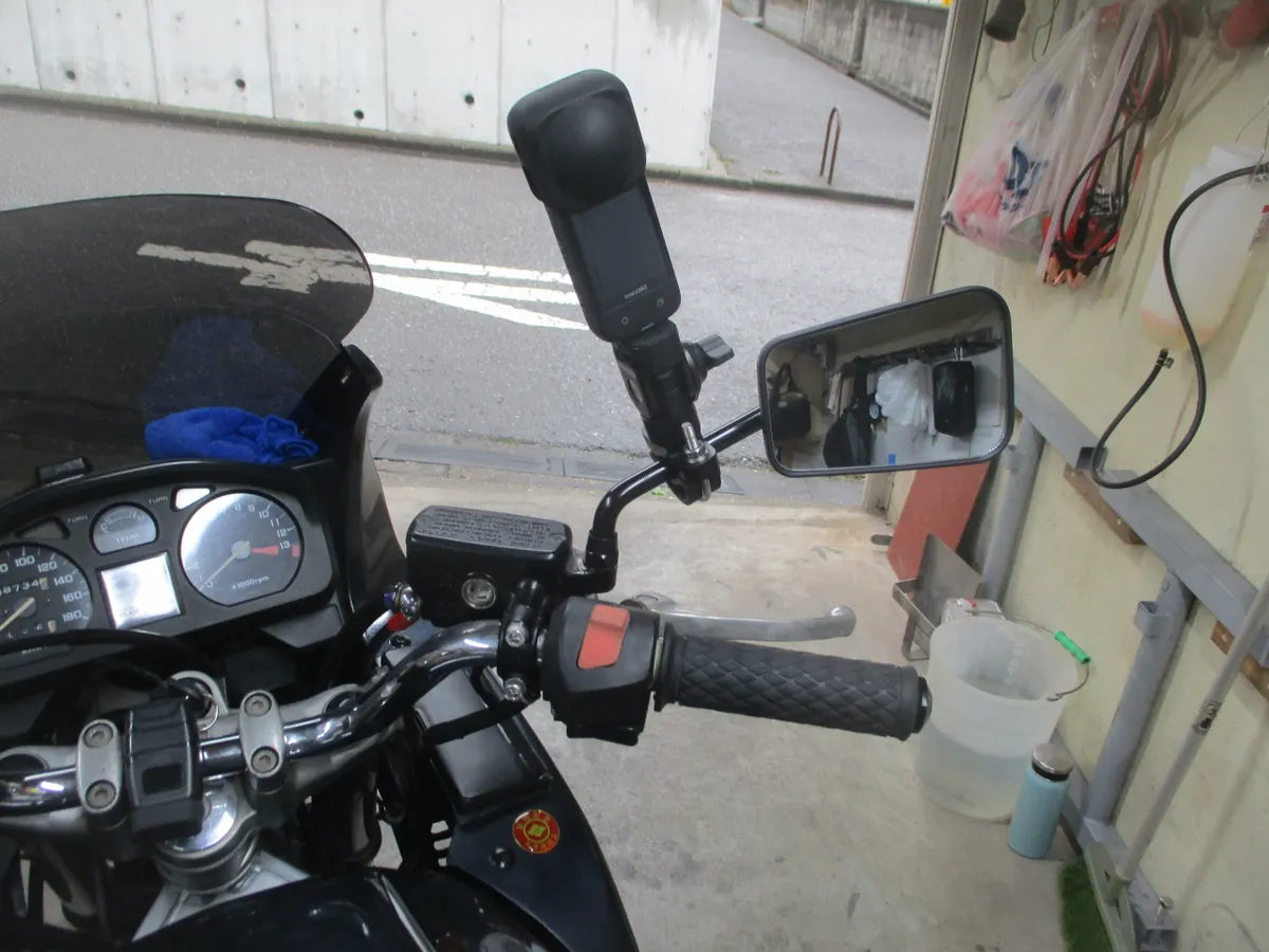 ミラーのステーに INSTA360 を取り付けてみました。(レンズカバー被せています。)