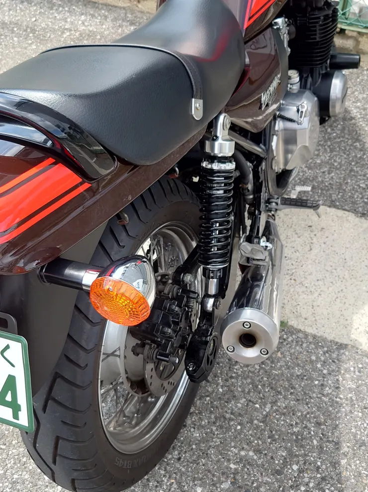 先日ちょっと調子が悪くドナドナされた時にフロントフォークのインナーチューブをついでに交換してもらったので、足回りは前後ともバッチリです。アジャスタブルリアショックの見た目もイイ感じ。