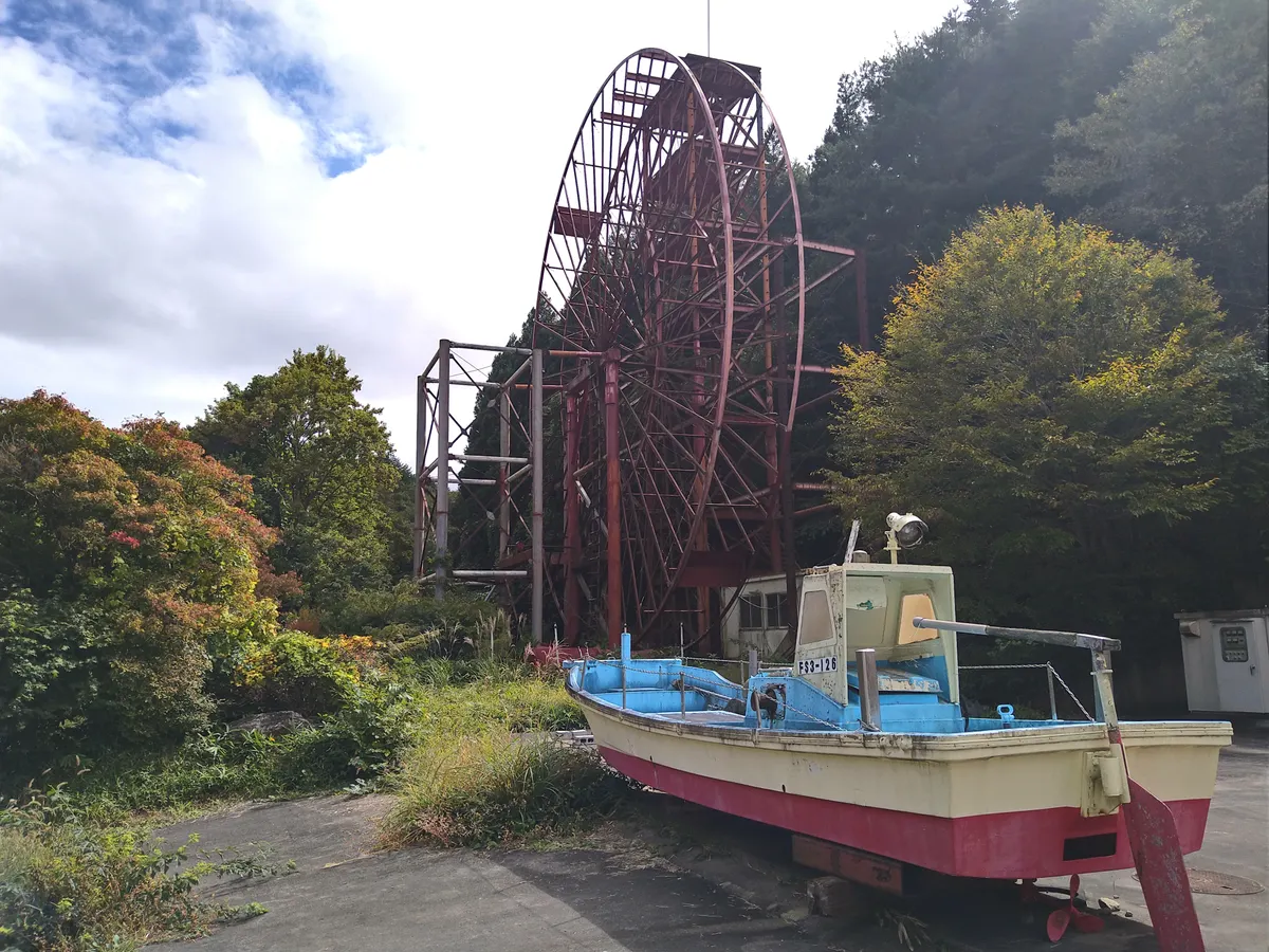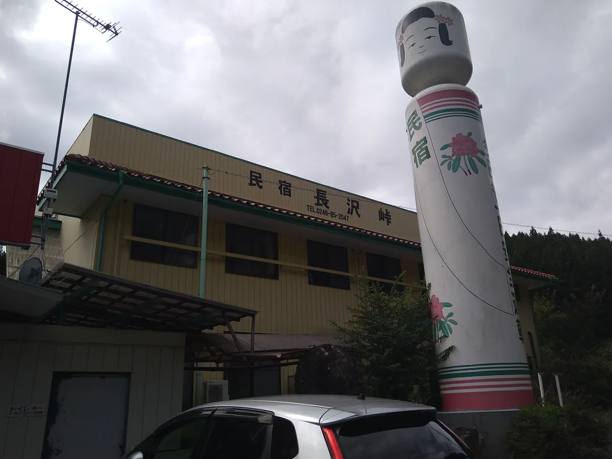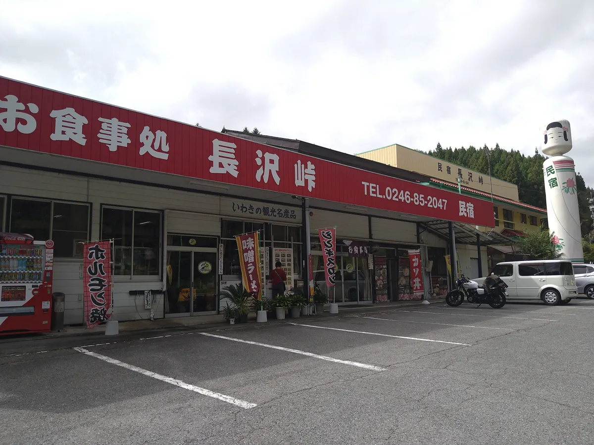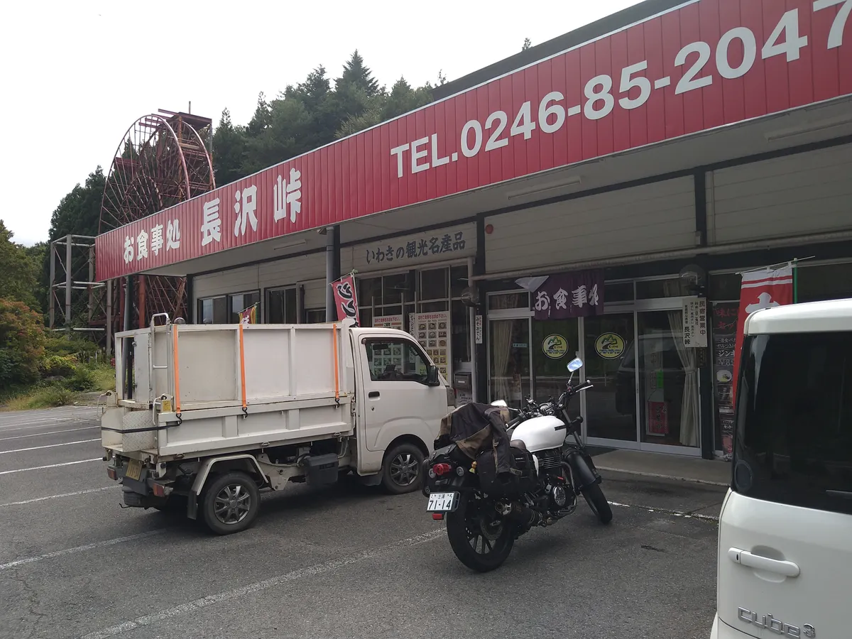 目的地は福島県の国道49号線にある「長沢峠ドライブイン」でジンギスカン定食を食べること。このドライブインは50年(一説には80年)以上の歴史があるドライブインで、巨大な水車(?)とコケシと船が目印です!