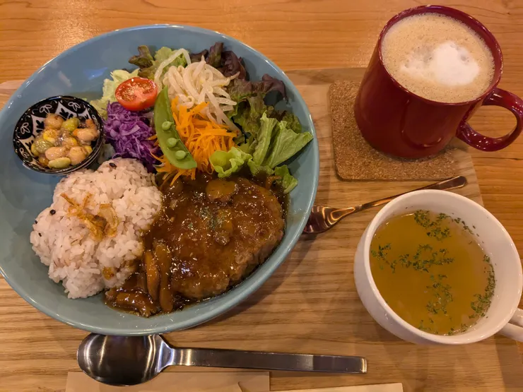 メニューはやはり仏にちなんで野菜メニューのヘルシー系。でもわたしはお肉たべたいのできのこハンバーグにしました。