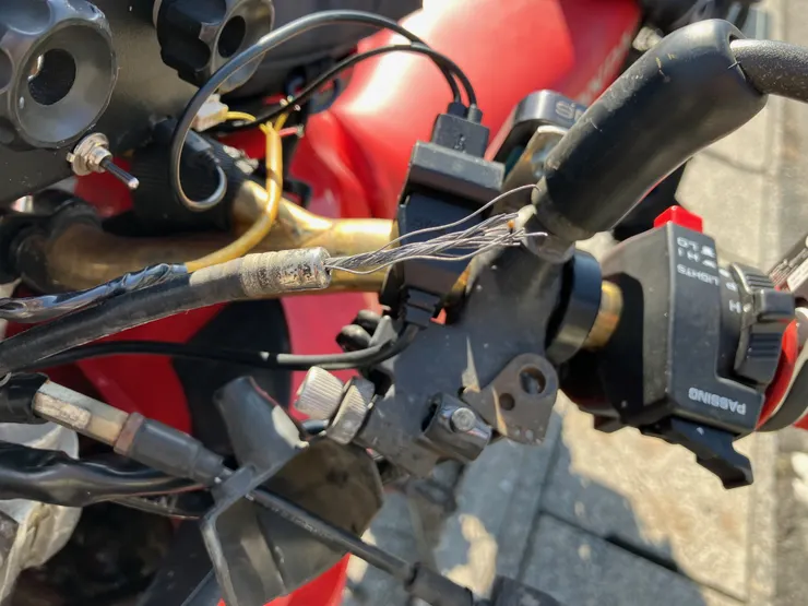 無転倒で調子よく進んでいたのですが・・・・昼食/休憩タイミングでルート上殆ど無いコンビニに立ち寄り、さあ出発だと思った瞬間にクラッチワイヤーがブツッと切れました。