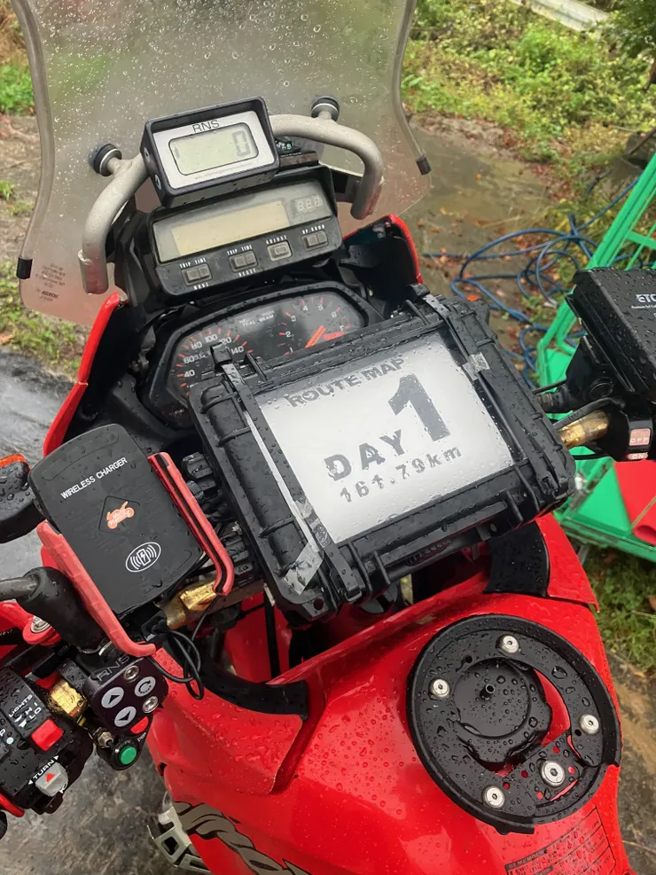 通常ですとタンクとリヤキャリアにバッグを装着していくのですが、雨のため箱付きで走ることにしました。
