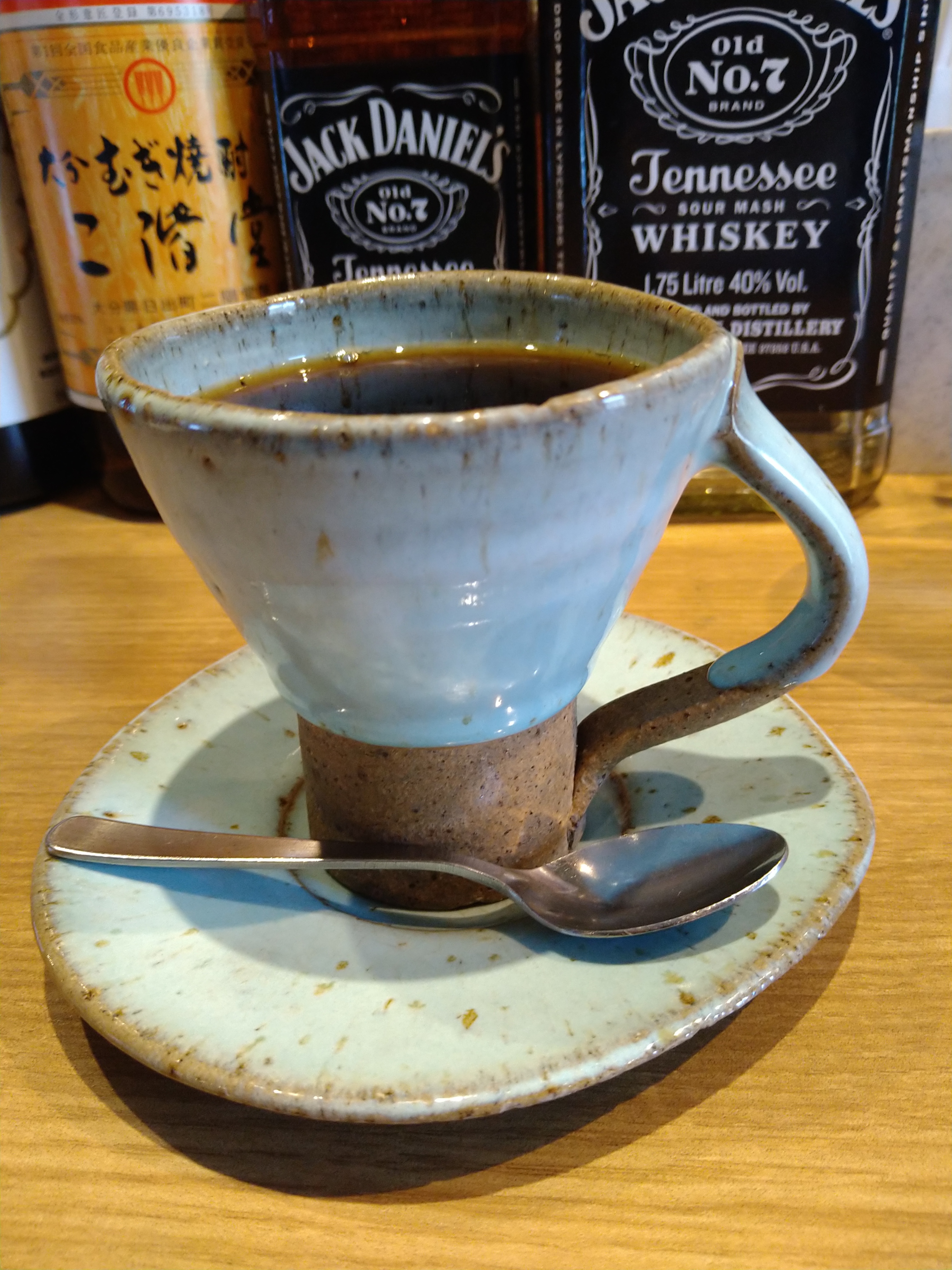 食後のコーヒー。この笠間焼カップはオーストリア人(窯を持っている)の方の作品とのこと。面白いデザインです。