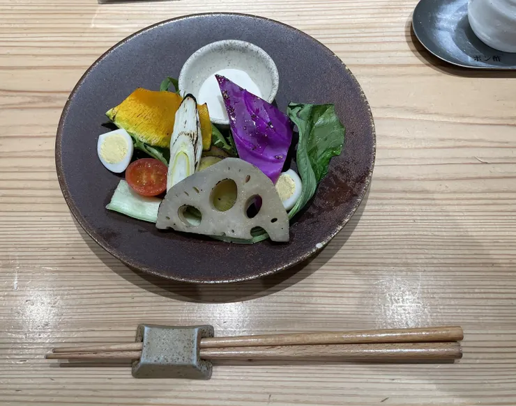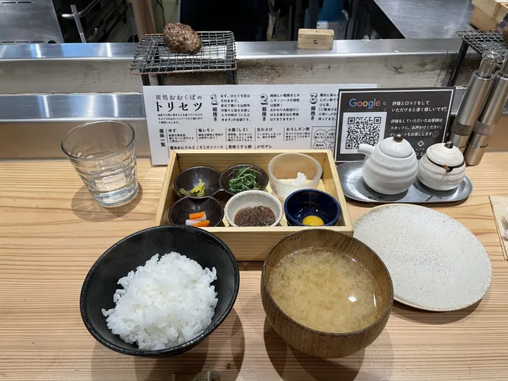 定番の「基本のセット」と「前菜」80gで異なる種類の炭火焼ハンバーグが細挽き・荒挽き・細挽きの順番に3回(240g)出てきました。色々な味で楽しめて、全部美味しかった(野菜・ごはん・味噌汁も)・・リピート確定