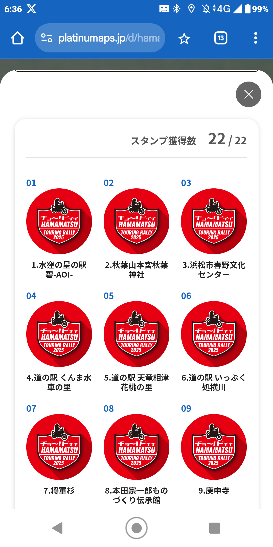 トップ > ツーリング行ってきたから見て > ハマツー2025デジタルラリー完走🏍️ かみ~ゆ 2025/10/19 21:03 ハマツー2025デジタルラリー完走🏍️ 土曜日は天気が怪しく、バイクイベントに行くのを辞めた😭 でも、バイクに乗ると何処かに走りたくなる。 知らぬ間に、ここに来てしまった。 秋葉神社上社ここまで来たら、残り6ヵ所廻って完走を目指す。 クシタニCafé舘山寺で写真は撮らず、お腹を満たしのた👅 お約束の写真も録った 志ぶき橋 舞阪宿脇本陣最後にSUZUKI歴史館に来たが、スズキ秋祭りをしていたので、ポイントゲットのみ。 完走したので、大歳神社に挨拶! 偶然、石津さんと会えたので完走を伝えました。 ハマツー2025デジタルラリー 大歳神社 いいね 共有する 共有する X facebook リンクをコピー コメントする 2 件の返信 (新着順) ミュートしたユーザーの投稿です。 投稿を表示 まるきよ【デイトナ社員】 2025/10/21 16:31 かみ~ゆ イッキメンも言っていますが、確かに気が付いたら到着している距離のすごさにビックリです。地元民よりも静岡県西部を走っているのではないかと思います😊 いいね 返信する ミュートしたユーザーの投稿です。 投稿を表示 イッキメン【デイトナ社員】 2025/10/20 10:05 こんにちは! 知らぬ間にここにきてしまった・・・の距離じゃないのがジワジワきます(笑) スタンプラリー完走お疲れ様でした!!! いいね 返信する ミュートしたユーザーの投稿です。 投稿を表示 かみ~ゆ 2025/10/20 21:24 イッキメン【デイトナ社員】 バイクに乗ると、夢遊病のように浜松方面に着いてしまう。 何かに取り憑かれてるかな?やらまいか~✊ いいね 返信する