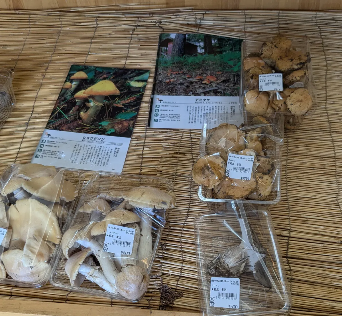 お!ショウゲンジがある…でも傘が開きすぎかも〜🤔クロカワはほろ苦で日本酒に合うらしいけど酒のまないし。アミタケは先日食べたから見置きします。