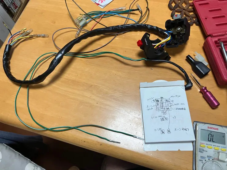 ドミネーターのカプラの各配線の色、スイッチのどこにつながっているのかを調べて必要な線と不要な線を判定し、バラして必要な配線だけに絞ってあります。