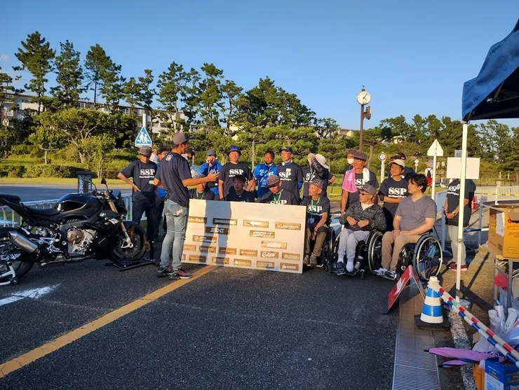 Side Stand Project -サイドスタンドプロジェクト-で使う補助輪付きバイクに中学生以下の方と障碍者の方を載せて手押しで乗車体験と画像とは別のSSPバイクで写真撮影。