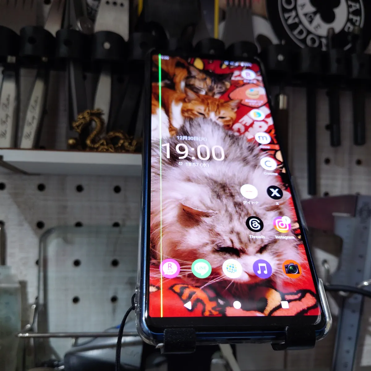 んでナビ用のスマホの液晶の左側に緑の線が!まったくもぉ。