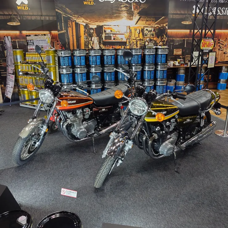 AZのブースでカワサキのZ1とZ2を発見しましたが、50年以上前の車両なのにツルテカでした。