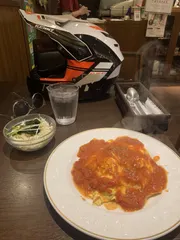 トマトソースがかかったオムライスですケチャップより酸味が効いているのが特徴 9/29のツーリング用にフロントのブレーキパッド交換して来ましたがかなり涼しくなって気持ちいい!