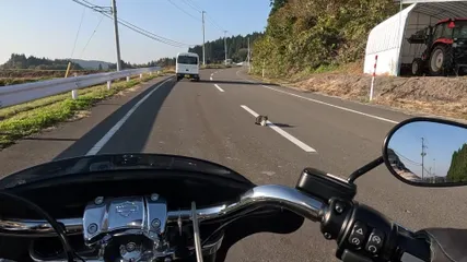 暇だったので用もなく盛岡のライコランドに行った時のこと前走車が急ブレーキしたので何かと思ったら道路の真ん中に猫様が鎮座しておりました「君、そんなところで座っていたら事故に遭うよ」と猫様の無事を祈りながらツーリング続けました、ってだけの話しです 写真はヘルメットマウントしたGoPro動画の切