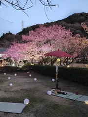 土肥金山土肥桜ライトアップ 土肥金山の土肥桜ライトアップされて茶道家の諏訪さんがお茶を点ててくれそのお茶を飲みながらヤングさんこと福山竜一さんが弾き語りをと言うイベントがあったので行ってきました。寒いので車でしたが。 土肥桜等のライトアップが中々でした! 土肥